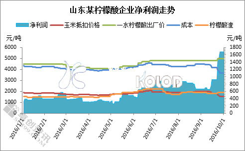 2016年第三季度檸檬酸生產(chǎn)企業(yè)的盈利狀況極好,在9月下旬企業(yè)一度盈利超過1500元/噸,利好因素有三,一方面是行業(yè)開工不足,供應(yīng)量緊張,成品檸檬酸售價不斷上漲;另一方面隨著春季玉米上市,深加工企業(yè)收購價格不斷下調(diào),生產(chǎn)成本降低;第三是在豆粕期貨現(xiàn)貨價格上漲的聯(lián)動下,副產(chǎn)品檸檬酸渣售價上調(diào)。